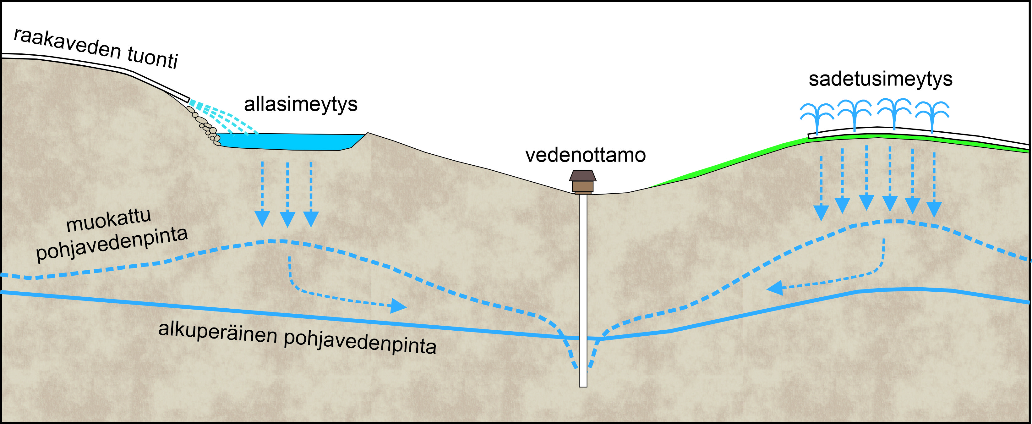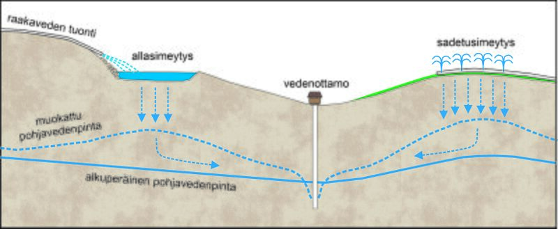 Tekopohjaveden muodostamisen periaate. Tekopohjavettä muodostettaessa raakavesi voidaan imeyttää pohjavesivyöhykkeeseen esimerkiksi allasimeytyksen tai sadetusimeytyksen kautta. Kuva on piirretty ja laajennettu Korkka-Niemen ja Salosen (1996) pohjalta. Kuva: Elina Lehtonen.