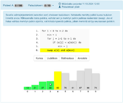 - Valintajärjestäminen: tietokone esittää yksiulotteisen taulukon arvot pylväsdiagrammina. Kun käyttäjä klikkaa hiirellä kahta pylvästä peräkkäin, näiden paikat vaihtuvat. Käyttäjän tarkoituksena on tehdä vaihtoja Valintajärjestäminen-algoritmin mukaisesti siten, että lopuksi pylväät ovat kasvavassa järjestyksessä.Visual algorithm simulation (VAS) is a software tool used in teaching and learning computer science. Typically VAS means an interactive, computerized exercise which a student interacts with to learn how a data structure or an algorithm works. A VAS exercise presents the student a visualization of a data structure with an input. The student simulates the execution of the algorithm by interacting with the visual representation, for example clicking the parts of a data structure with a mouse. The interaction changes both the logical and the visual representation. For example, values in an array or the nodes in a search tree swap their locations. An instructor can use a VAS software on a lecture to demonstrate an algorithm for students. VAS exercises may also have automated assessment.